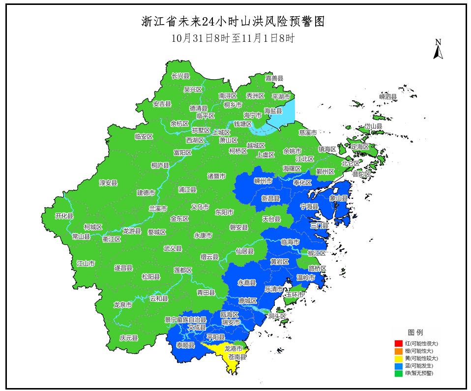 省水利厅、省气象局10月31日7时46分联合发布山洪灾害预警:根据省气象台未来降雨预报,预计10月31日8时至11月1日8时,苍南县发生山洪灾害可能性较大(黄色预警),奉化区、象山县、宁海县、鹿城区、龙湾区、瓯海区、永嘉县、平阳县、文成县、泰顺县、瑞安市、乐清市、新昌县、嵊州市、黄岩区、三门县、温岭市、临海市可能发生山洪灾害(蓝色预警)。