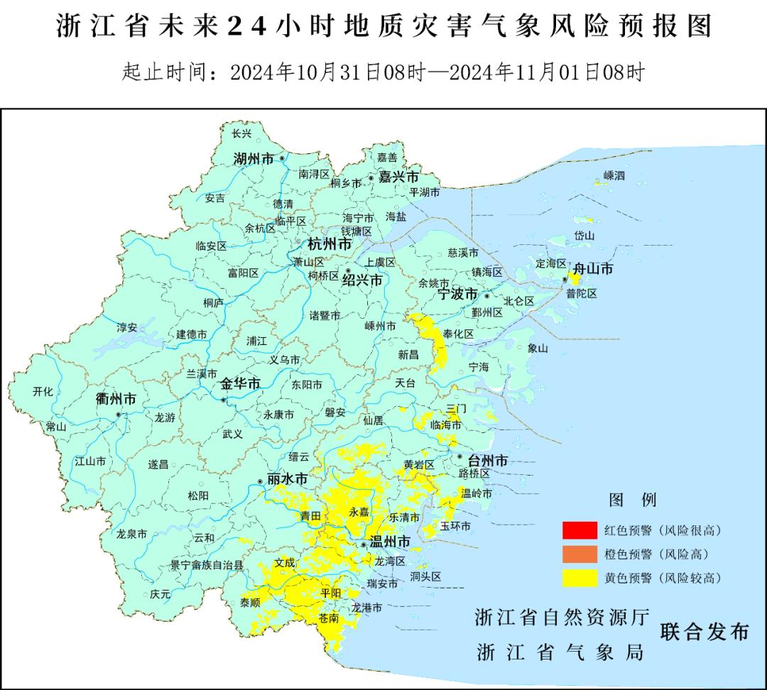 10月31日上午,省自然资源厅、省气象局联合发布未来24小时地质灾害气象风险等级预报,10月31日8时至11月1日8时,宁波市(奉化区、宁海县、余姚市)、温州市(鹿城区、龙湾区、瓯海区、洞头区、永嘉县、平阳县、苍南县、文成县、泰顺县、瑞安市、乐清市、龙港市)、舟山市(定海区、普陀区、岱山县、嵊泗县)、台州市(椒江区、黄岩区、三门县、仙居县、温岭市、临海市、玉环市)、丽水市(青田县、景宁畲族自治县)等部分地区地质灾害气象风险较高(黄色预警)。请密切关注雨量情况,做好地质灾害防范工作。