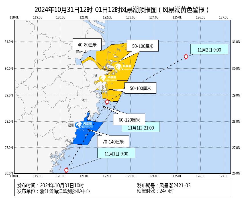 48小时预报:11月1日中午到11月2日中午,嘉兴沿岸将出现40到80厘米的风暴增水,舟山、宁波、温州沿岸将出现50到100厘米的风暴增水,台州沿岸将出现60到120厘米的风暴增水。舟山、宁波、台州市风暴潮预警级别为蓝色。72小时预报:预计2日下午视情况解除风暴潮警报。