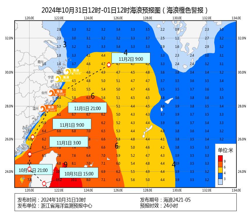 10月31日10时,浙江省海洋监测预报中心发布风暴潮黄色警报、海浪橙色警报。