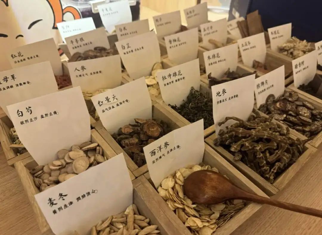 还有药材放在六格盘里的祛湿茶、润喉茶和熬夜茶,最近元气森林中式养生水和南京中医院的瘦身饮大火,而我为了把中式养生这门博大精深且颇具古风的传统课程学明白,选择了来按摩店学习认药材。