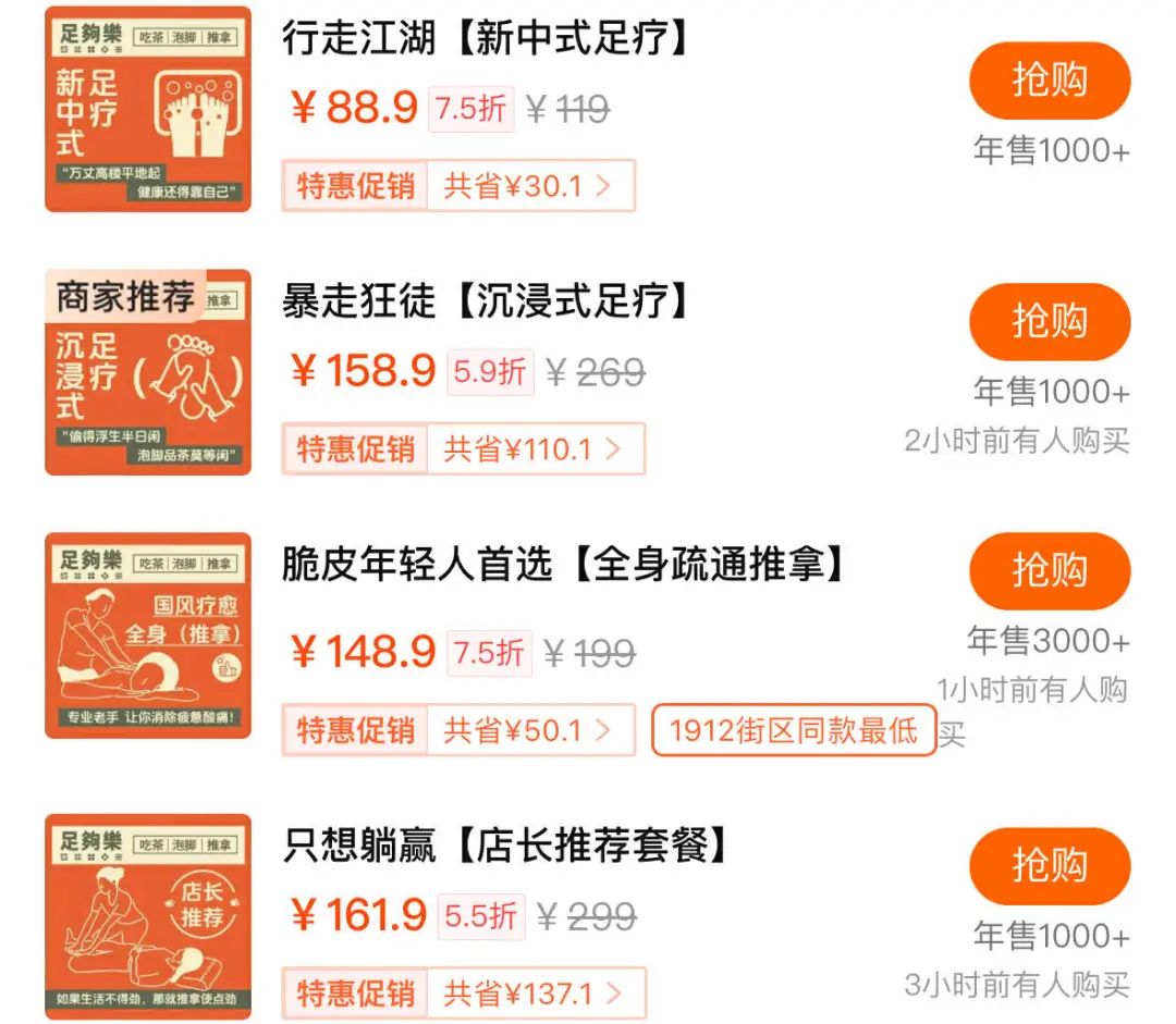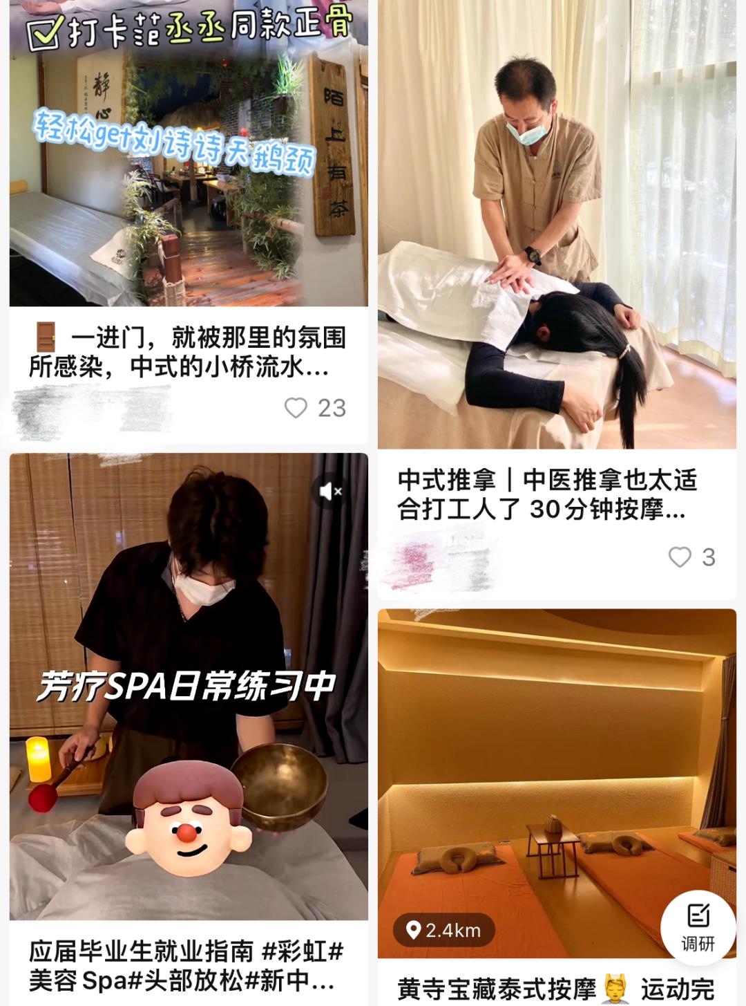 比起来奶茶们颇具中式意蕴的“茉、绝弦、纸鸢、糯山”,按摩店的产品名竟然显得有些粗犷,大抵还是受了行业调性影响。不过按摩的价格确实被“打”下来了。上班上一半去捏脚的服务低至能30块就拿下,那些被美食博主拍成自助餐的吃席式按摩一般也就100出头,直接在平台上下单,主打一个随处大小按。