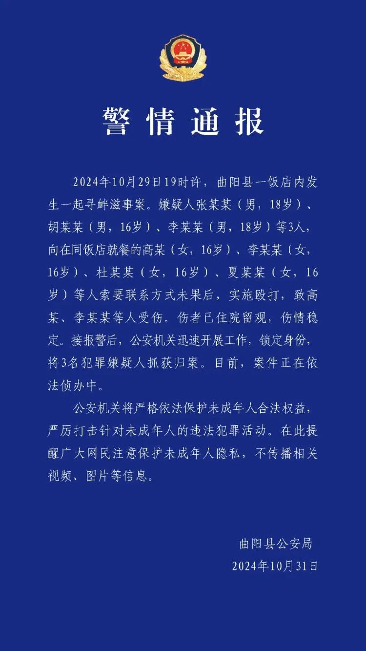 “平安曲阳”微信公众号10月31日下午通报,10月29日19时许,河北曲阳县一饭店内发生一起寻衅滋事案。嫌疑人张某某(男,18岁)、胡某某(男,16岁)、李某某(男,18岁)等3人,向在同饭店就餐的高某(女,16岁)、李某某(女,16岁)、杜某某(女,16岁)、夏某某(女,16岁)等人索要联系方式未果后,实施殴打,致高某、李某某等人受伤。伤者已住院留观,伤情稳定。接报警后,公安机关迅速开展工作,锁定身份,将3名犯罪嫌疑人抓获归案。目前,案件正在依法侦办中。