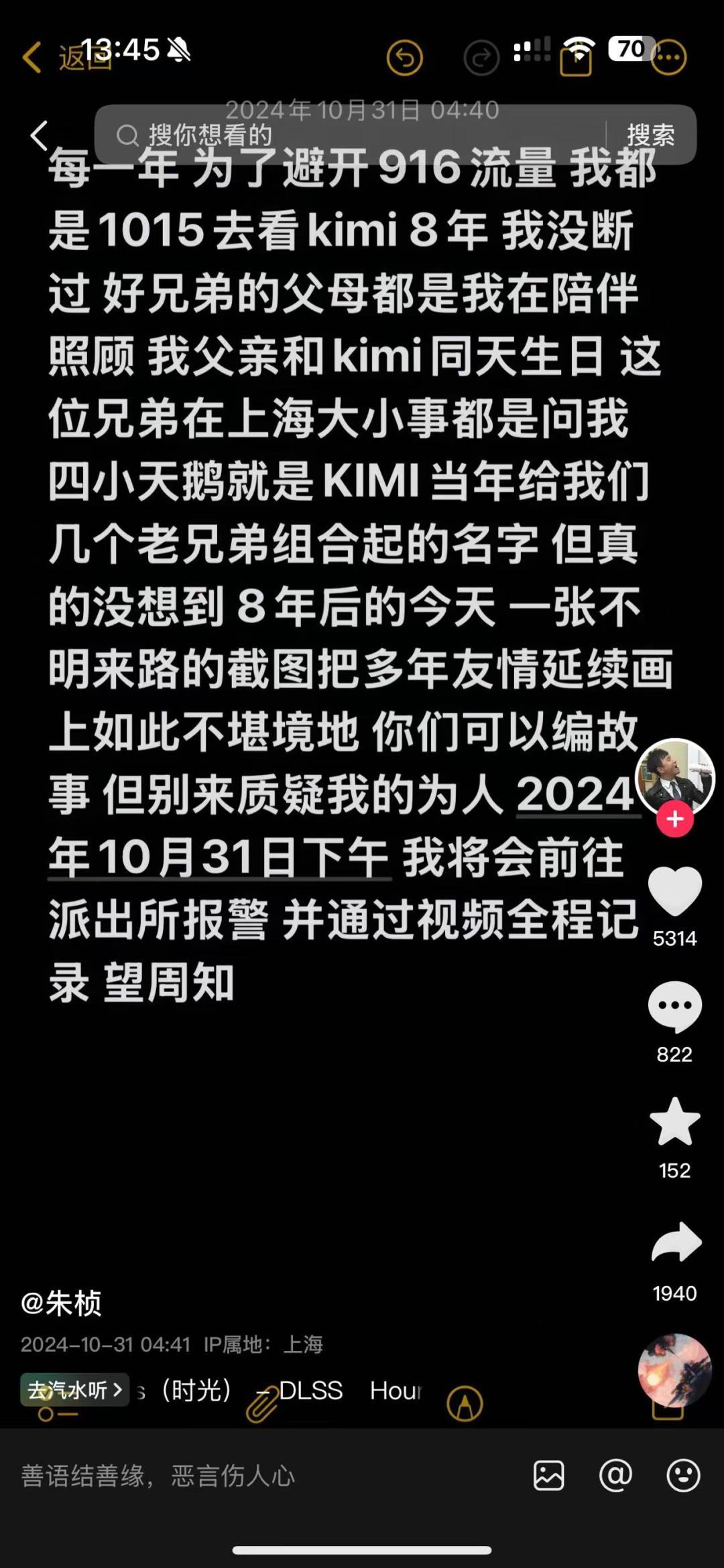 今(31)日,乔任梁的父母在个人社交媒体发出文字,表示:“网上铺天盖地的遗体照片,这无疑是对我们二次伤害,不想回忆,但是不得不回忆。乔宝确确实实是抑郁症走的,当时我觉得乔宝的手很肿,就让工作人员把手盖在花里……我们真的很痛苦,不想去回忆这些细节,但是一些有心的人一直问这种问题,现在我统一在这边和爱我们的家人说了,也希望我的老粉宝宝们,不要被带节奏。”此外,传闻中被提及的乔任梁生前好友朱桢发文称将于今天下午去报警: