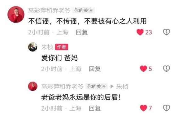 然而评论区却出现关于乔任梁和朱桢的负面传闻,朱桢回复此条评论:“发的人是谁,请他和我‘对线’,别躲在暗处。”对于该传闻,乔任梁父母也多次在评论区回应,“不信谣、不传谣,希望大家不要被有心之人利用。”“朱桢对我们的付出,相信你们有目共睹。”
