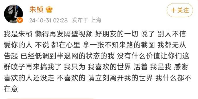 图源:相关方社交账号31日凌晨,朱桢曾发文表示,“拿一张不知来路的截图,我都无从告起。”“请离开我的世界,我什么都不在意。”