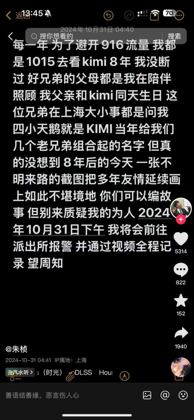 图源:当事人社交账号当日,朱桢再次回应传闻,表示自己会去报警。
