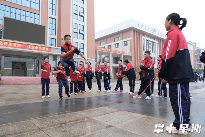 春华中学校园内,孩子们在课间组织团体跳绳活动。然而此前,春华中学因校园环境差、教学质量不理想导致生源大量流失。春华中学校长对学校的简陋场景记忆犹新:校园杂草丛生,只有一栋教学楼和宿舍楼,设施设备破旧不堪,200米的操场跑道坑坑洼洼……当时学生不断转学到星沙街道和黄花镇的学校就读,学校只剩下不到200名学生。