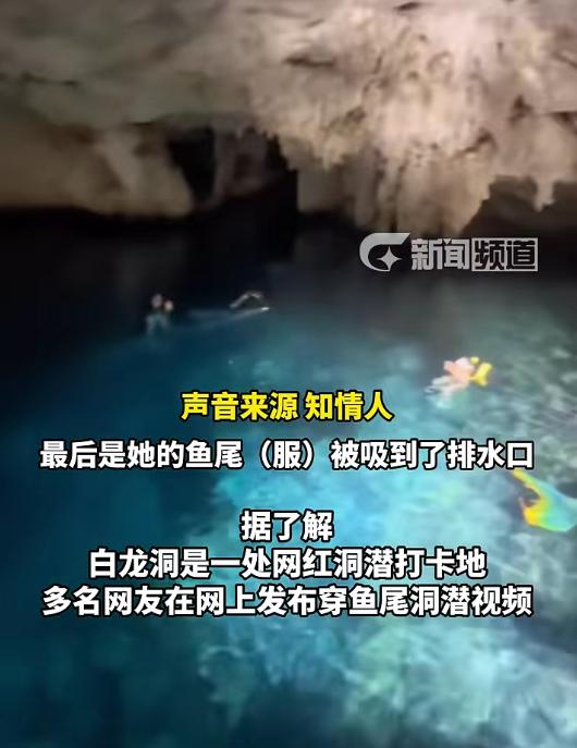 据知情人描述,该女子因鱼尾服被吸到排水口所以溺水。据了解,白龙洞在网络上是一处洞潜打卡地,多名网友曾在网上发布穿鱼尾服洞潜的视频。