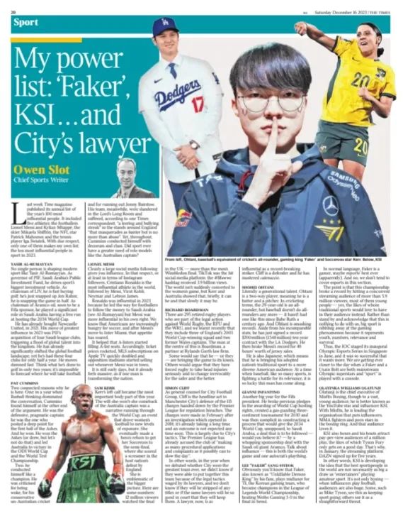 这是《泰晤士报》十大体坛人物中首次出现电竞选手,此名单除Faker之外还包含世界级足球选手梅西。