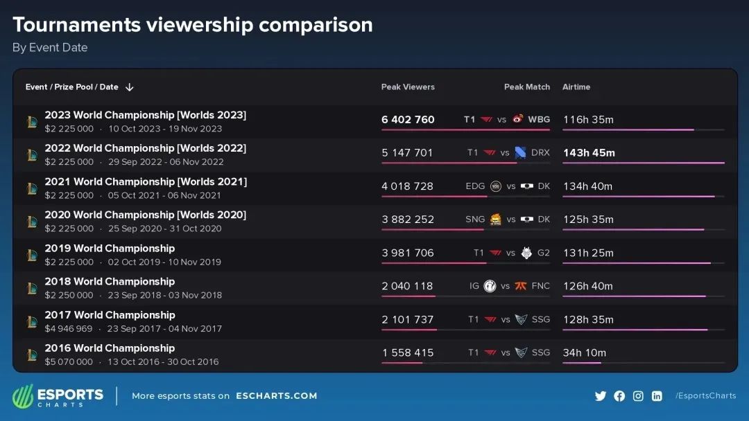 2020年,T1再度无缘总决赛,彼时观看人数下降至388万。直至2023年。英雄联盟全球总决赛的决赛成为有史以来收视率最高的电子竞技比赛。获得了640万人的峰值观看数。