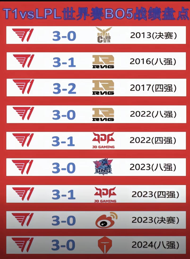 时至今日,全华班的再度落败让观众看到了两大赛区的真实差距,据统计,从2013年到2024年11年间,LPL战队在BO5的比赛中,共计与T1交手过10次,未尝一胜。