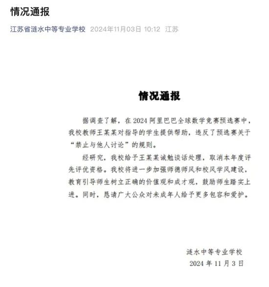 11月3日,江苏省涟水中等专业学校发布情况通报:据调查了解,在2024阿里巴巴全球数学竞赛预选赛中,我校教师王某某对指导的学生提供帮助,违反了预选赛关于“禁止与他人讨论”的规则。经研究,我校给予王某某诫勉谈话处理,取消本年度评先评优资格。