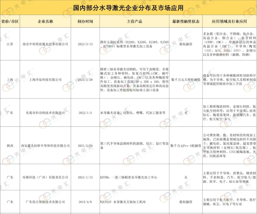 在全球范围,水导激光相关的核心产品目前主要来自于两家瑞士公司——Synova和AVonisys公司,前者采用绿光激光器,后者采用红外激光器。而我国在水导激光装备开发方面相对国际先进水平还有较大差距,同时,缺乏成熟稳定的设备也制约了相关行业加工技术的发展[3]。表1是国内部分水导激光企业分布及产品的市场应用。