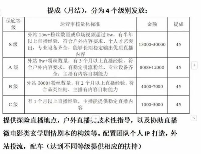 记者调查发现,前述以“户外探险玄学灵异”为标签的“安陌直播”,将签约主播的提成发放标准分为四类,S级、A级、B级、C级。其中S级等级最高,即外站超过15万粉丝数量,或单场视频超过5万,有半年以上直播经验,符合户外内容要求、个人才艺突出,专业设备齐全,能够长期稳定输出优质直播内容。收益在13000元至30000元不等。
