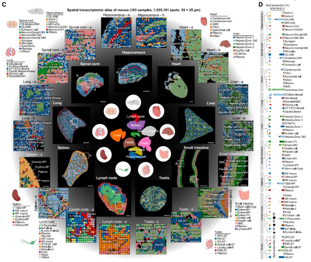 在这项最新研究中,研究团队选取了2月、4月、13月、19月和25月龄的小鼠(相当于人类从青年到老年),利用时空组学技术(Stereo-seq)对它们的海马体、脊髓、心脏、肺、肝脏、小肠、脾脏、淋巴结和睾丸等9个器官和组织进行了分析,最终形成了一张包含72个细胞类型的多器官衰老时空图谱(命名为Gerontological Geography,简称GG)。该图谱不仅能“看到”不同细胞内基因的表达情况,还能精确定位每个细胞的位置。