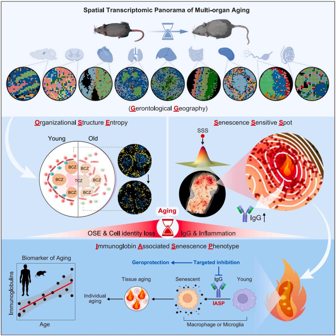 该研究绘制了首个哺乳动物多器官衰老的空间转录组图谱,揭示了组织结构紊乱和细胞身份丢失是衰老的关键标志,并精确定位了衰老敏感的核心区域及微环境特征。该研究提出的免疫球蛋白相关衰老表型(Immunoglobin-associated Senescence Phenotype,IASP)不仅拓展了衰老科学的研究领域,还为延缓衰老及防治相关疾病开辟了新路径。