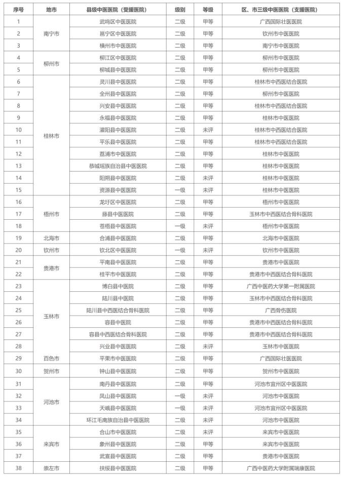 广西新增19家城市三级中医医院对口支援38家县级中医医院,支援时间为2025年1月至2028年12月。《通知》还要求,国家和自治区级区域医疗中心要充分发挥辐射带动作用,积极开展支援工作。