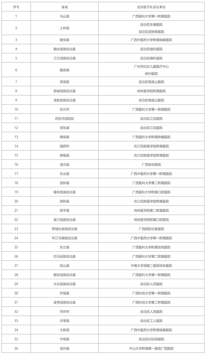 1.“组团式”帮扶。自治区统筹安排,继续由广东和区内实力较强的23家三级医院每年选派上百名帮扶队员,按5至6人规模组建20个帮扶团队,帮助20个国家乡村振兴重点帮扶县建强县人民医院。