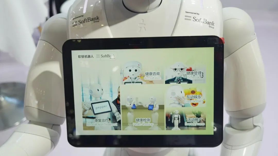 在其中一台Pepper机器人的面板上,“健康咨询”“健康检测”“康复治疗”等功能区十分醒目。通过融合智能体技术,Pepper可以协助医护人员,为老年人提供情感交互和生活辅助。据介绍,Pepper能够制定智能化、个性化的记忆训练和健康锻炼计划,外接相应的医疗设备后,还能及时反馈老年人的健康情况,对异常指标进行科学预警,目前已经在国内外部分老年中心投入使用。