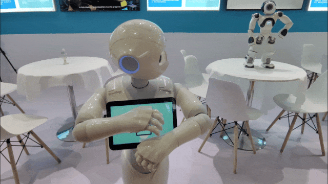 在技术装备展区,正在与观众流畅对话的人形机器人吸引了记者的注意。通体白色、身高1.2米,这款名为Pepper的机器人由软银机器人集团研发,能够观察互动者脸部的表情变化,进而选择合适的回应方式。