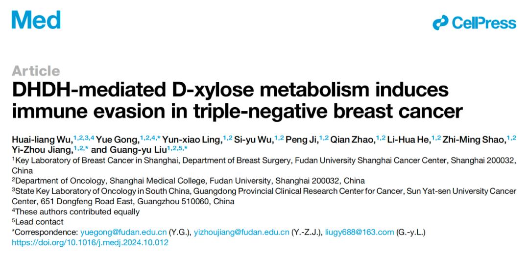 2024年11月7日,复旦大学附属肿瘤医院柳光宇、江一舟、龚悦等人在 Cell 子刊 Med 上发表了题为:DHDH-mediated D-xylose metabolism induces immune evasion in triple-negative breast cancer 的研究论文。