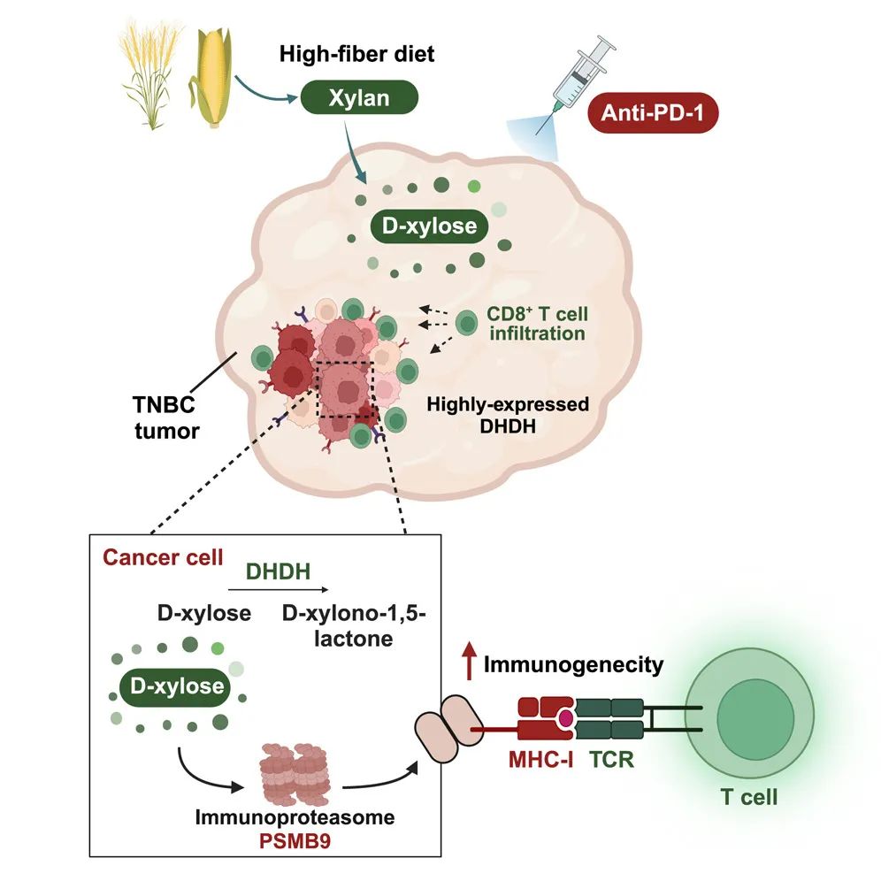 这一发现为在DHDH高表达的三阴性乳腺癌(TNBC)患者中将D-木糖或富含木糖的饮食(例如高纤维膳食)与免疫治疗联合,提供了理论支持。