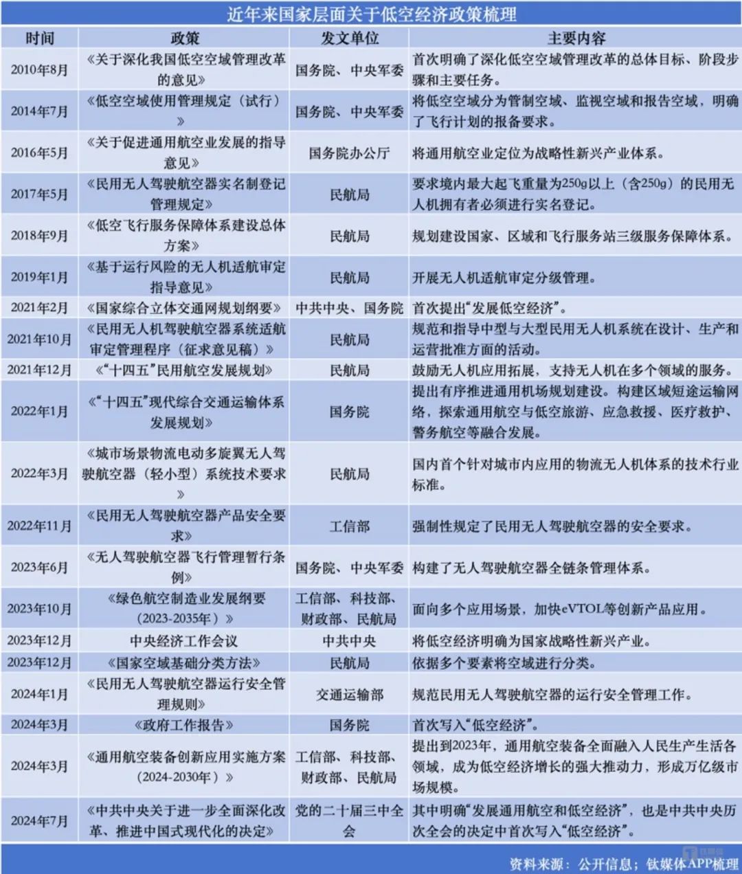 回溯来看,早在2010年11月,国务院、中央军委就发布《关于深化我国低空空域管理改革的意见》,首次明确了深化低空空域管理改革的总体目标、阶段步骤和主要任务。此后数年,国务院、民航局等间或有关于低空、通用航空、无人机等的政策出台。