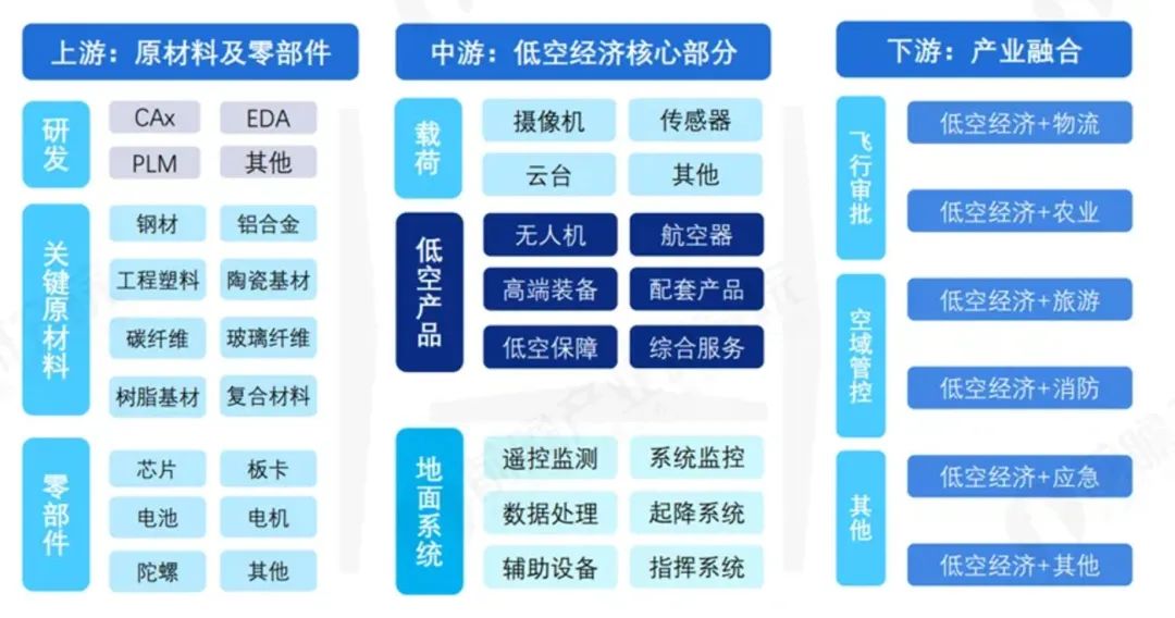 低空经济涉及上游原材料及零部件,中游载荷、低空产品、地面系统,下游产业应用等。也有将低空经济总结为“天地人机”四个关键要素,即开放的空域、地上的基础设施、专业的人才和产业链的配套。但无论怎么划分,产业链条长、涉及面广是基本特征。