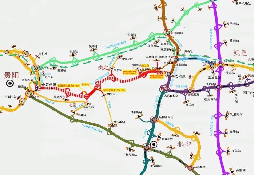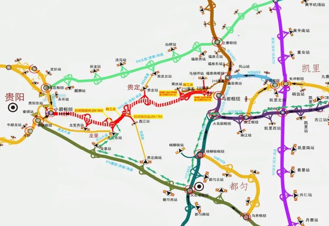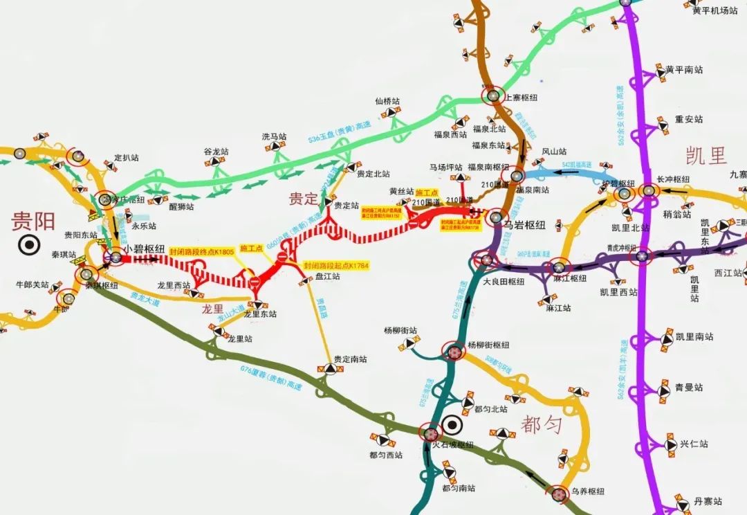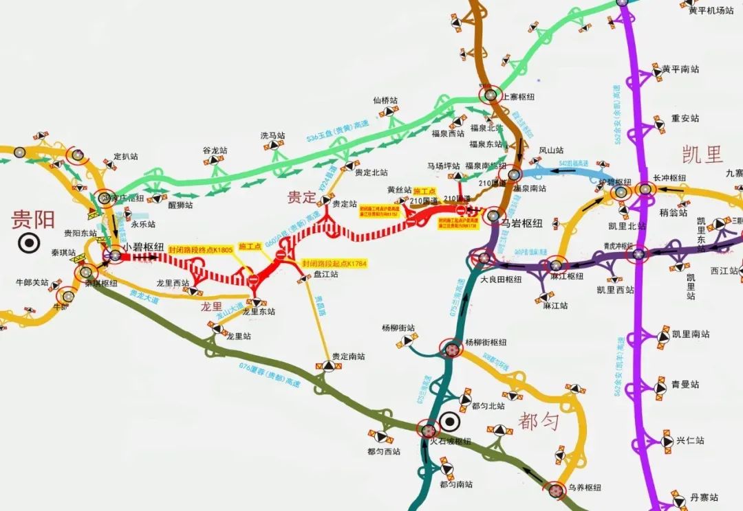 1.封闭路段。沪昆高速公路马场坪收费站(1738公里800米)至黄丝收费站(1752公里200米)双向封闭,沪昆高速公路盘江收费站(1785公里600米)至龙里东收费站(1805公里)双向封闭。