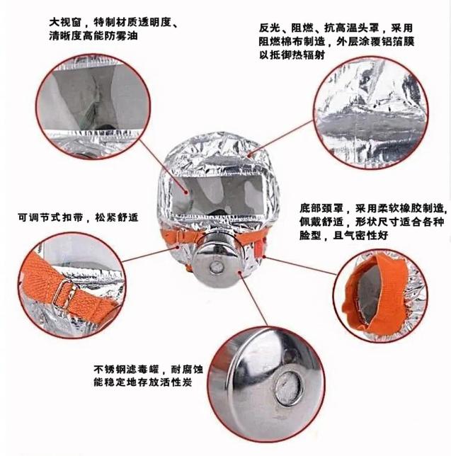3、头罩的表面涂覆的铝箔膜能够反光,消防员能够更容易看到逃生者,从而营救他们。