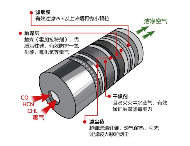 防烟面罩具有过滤和分解一氧化碳等毒气的作用