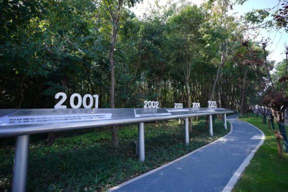 值得一提的是,道路两侧的绿道还分别安装了充满历史文化的景观小品,用时间轴的形式讲述了莘庄工业区近三十年的历史变革,展现园区的特色风貌。分为1995年—2005年、2006年—2015年、2016年—2025年三个时间段,分别讲述了园区不同阶段的发展历程。