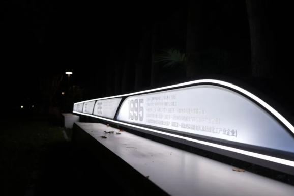 春申初旭、如日方升、重器生辉……漫步在道路两侧的绿道,分别能够阅读从莘庄工业区自1995年获批成立以来的重要事件以及所获荣誉等。还有航天元素的趣味景观小品,八大行星的名称和图画一一对应,起到装饰和益智效果。到了夜晚,景观灯亮起,金属材质和线条字体展现出未来的科技感。