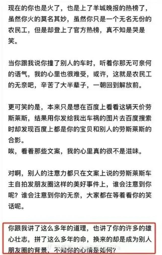 李光说,父亲长年在广州打工,主要从事货车司机工作。11月4日,父亲李先生在广州与一辆劳斯莱斯发生刮擦。事发几个小时后,父亲才将此事告诉家人,他们后续一起在微信群与女车主商量后续理赔事宜。