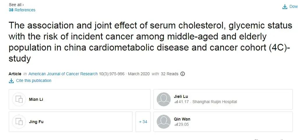 此前,上海交通大学医学院附属瑞金医院的研究人员发表在《美国癌症研究杂志》的一项研究,研究人员对我国在2014~2016年的多个心血管代谢病、癌症队列研究项目进行了荟萃分析,涉及全国16个省市、20个社区站点的13.8万名受试者进行了中位3.8年的随访。