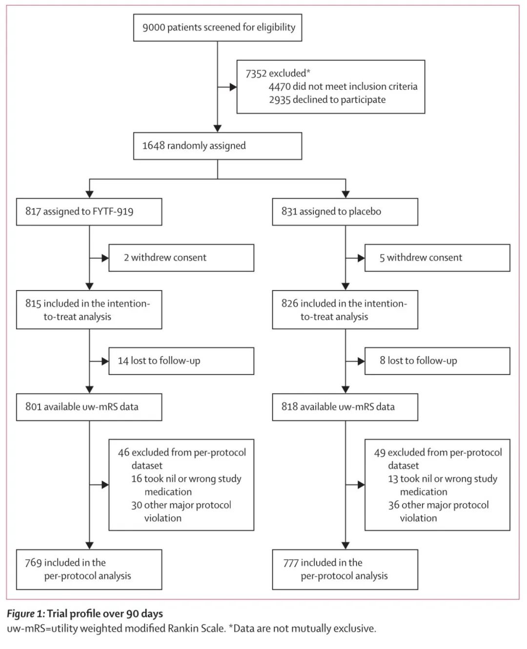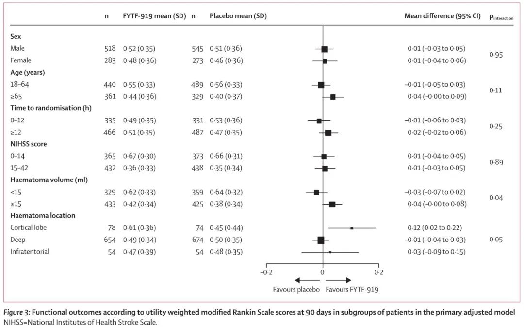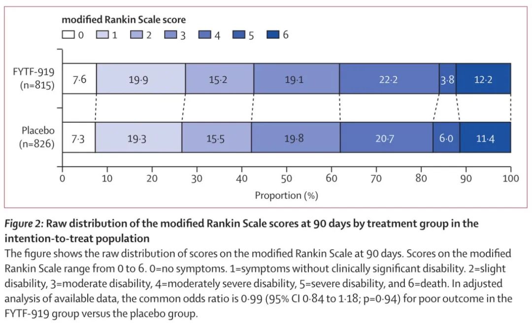 结果2021年11月24日至2023年12月28日,CHAIN研究共筛选了9000名患者,纳入1648例急性脑出血患者, 817例患者被随机分配到了FYTF-919组,831例患者被随机分配到了安慰剂组。FYTF-919组的2名患者和安慰剂组的5名患者在接受治疗之前退出知情同意,因此1641名有主要结局数据的患者被纳入意向性治疗集,包含FYTF-919组的815例和安慰剂组的826例患者。1242(75.7%)的患者服用了超过80%的药物,994名(60.6%)患者完全遵从方案,在28天内服用完所有药物。FYTF-919组和安慰剂组的90天UW-mRS平均值都是0.44,两组之间没有显著差异(difference 0.01, 95% confidence interval, -0.02 to 0.04; p=0.63)。各项敏感性分析结果均一致,两组的严重不良事件也没有显著差异。
