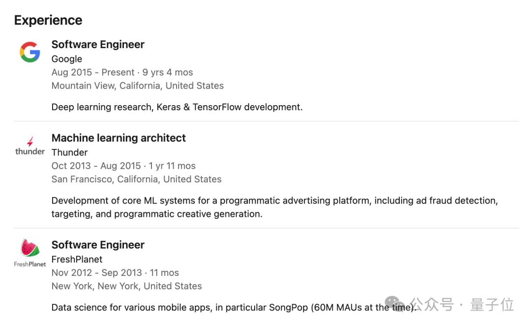 François先后分别在FreshPlanet和Thunder分别担任软件工程师和机器学习架构师;最后于2015年加入谷歌,直至今天。