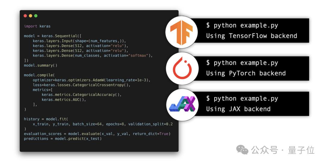 不仅支持TensorFlow、PyTorch、Jax三大框架作为后端,还能在它们之间无缝切换,甚至混合使用。
