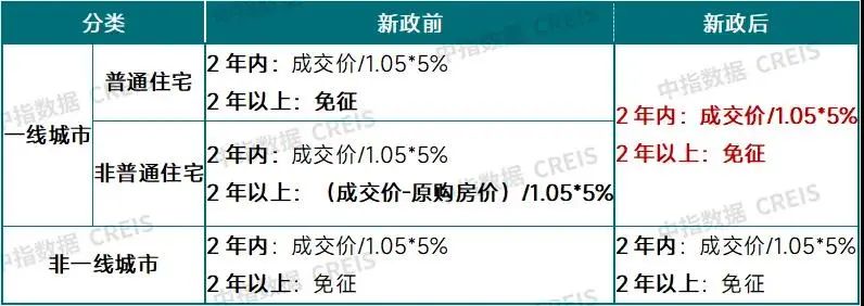 新政:北京市、上海市、广州市和深圳市,凡取消普通住宅和非普通住宅标准的,取消普通住宅和非普通住宅标准后,与全国其他地区适用统一的个人销售住房增值税政策,对该城市个人将购买2年以上(含2年)的住房对外销售的,免征增值税。