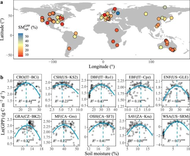 生态系统总初级生产力(GPP)是大气与生物圈之间最大的碳通量,受土壤水分影响很大。然而,人们对 GPP 对土壤水分的响应和适应仍知之甚少,导致在地球系统模型中表征土壤水分对 GPP 的影响存在很大的不确定性。