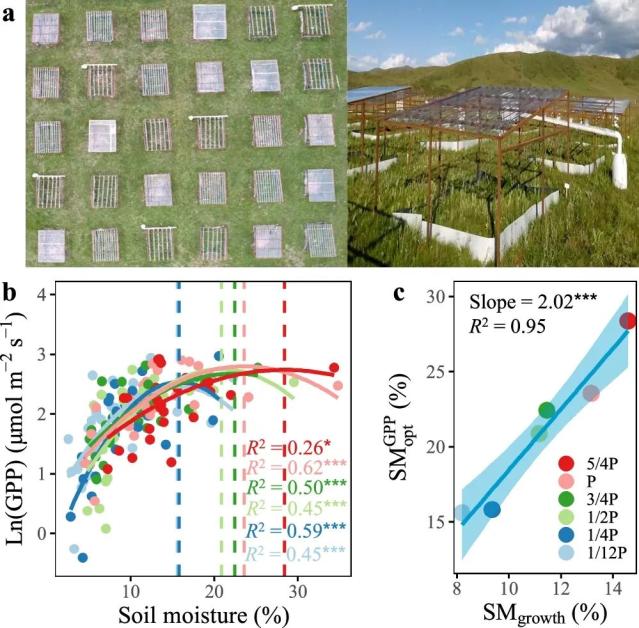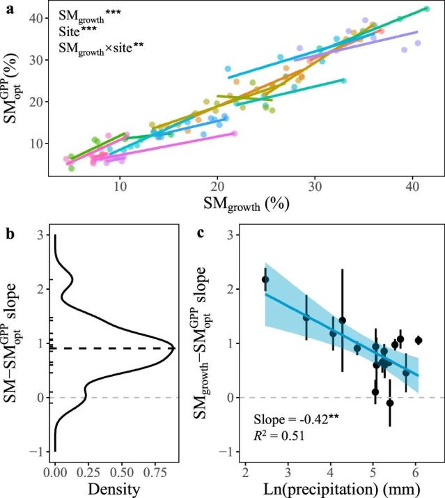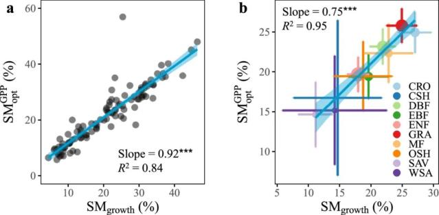 SMGPPopt的变化主要由当地水资源可用性解释,较干旱的生态系统的SMGPPopt低于较湿润的生态系统,这反映了SMGPPopt的水分适应。这种适应得到了一项仅调控水而保持其他因素不变的田间试验的进一步支持,该试验表明,在长期缺水后SMGPPopt呈现下降趋势,因此GPP最大化时所需的土壤水分较少。