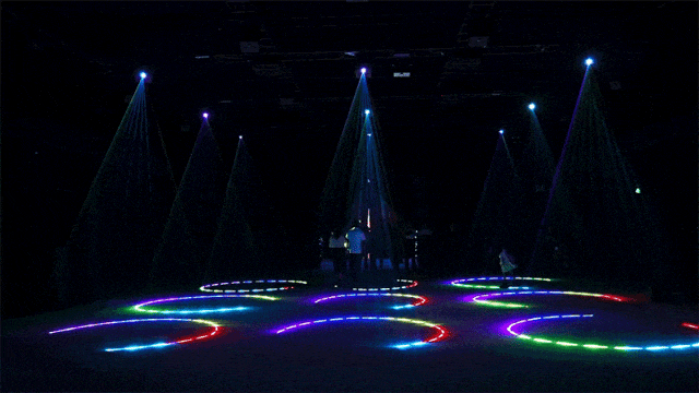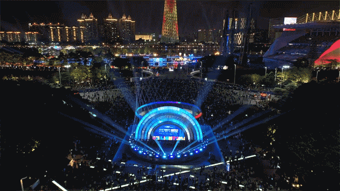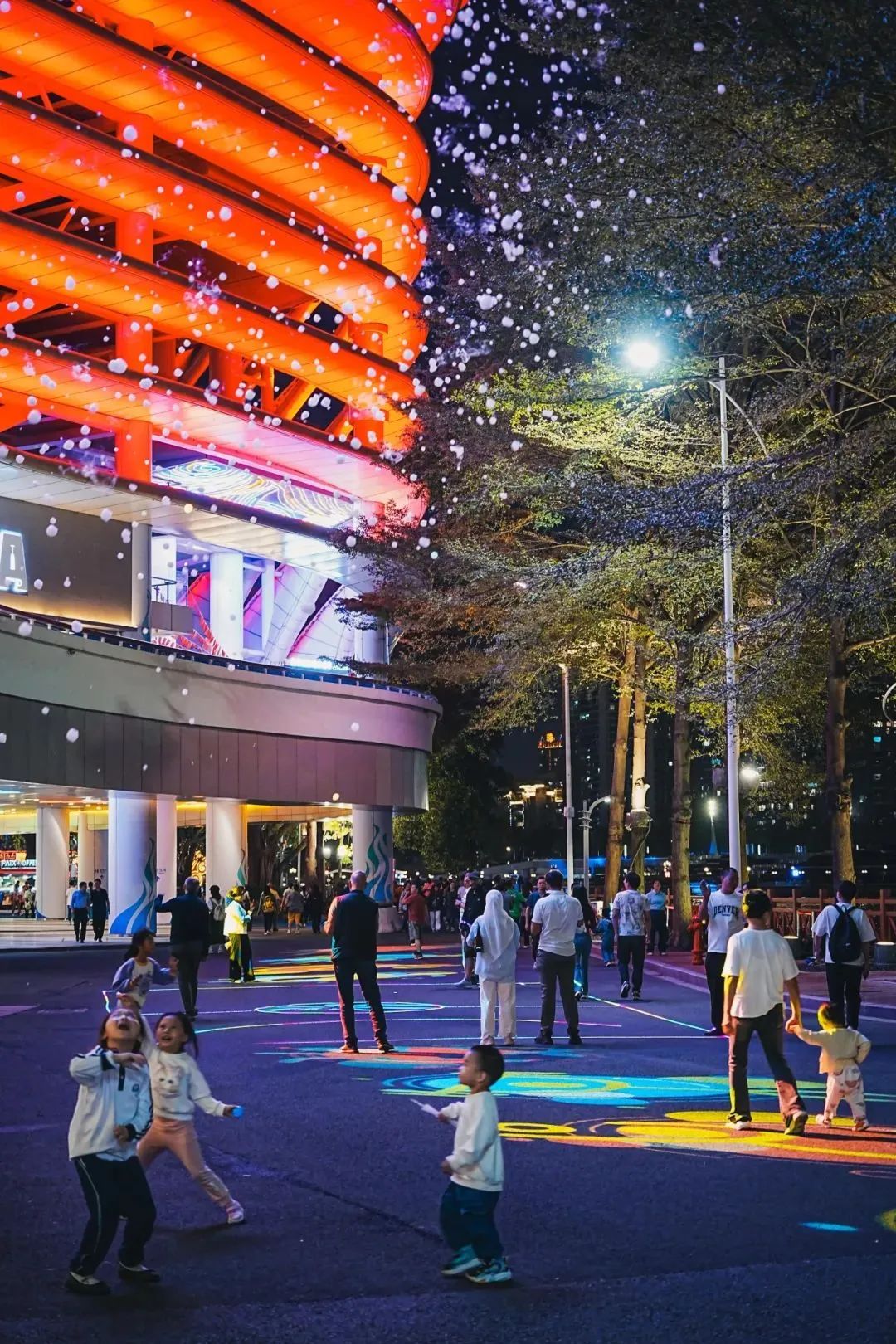 灯光节将十五运各项体育赛事的标志性动作,以光影的形式生动再现。灯光氛围作品融入水雾机、泡泡机等元素,以虚拟运动竞技的方式,利用激光与市民游客进行互动,呈现湾区活力感的同时,传递对十五运会全城欢动的关注与期待。