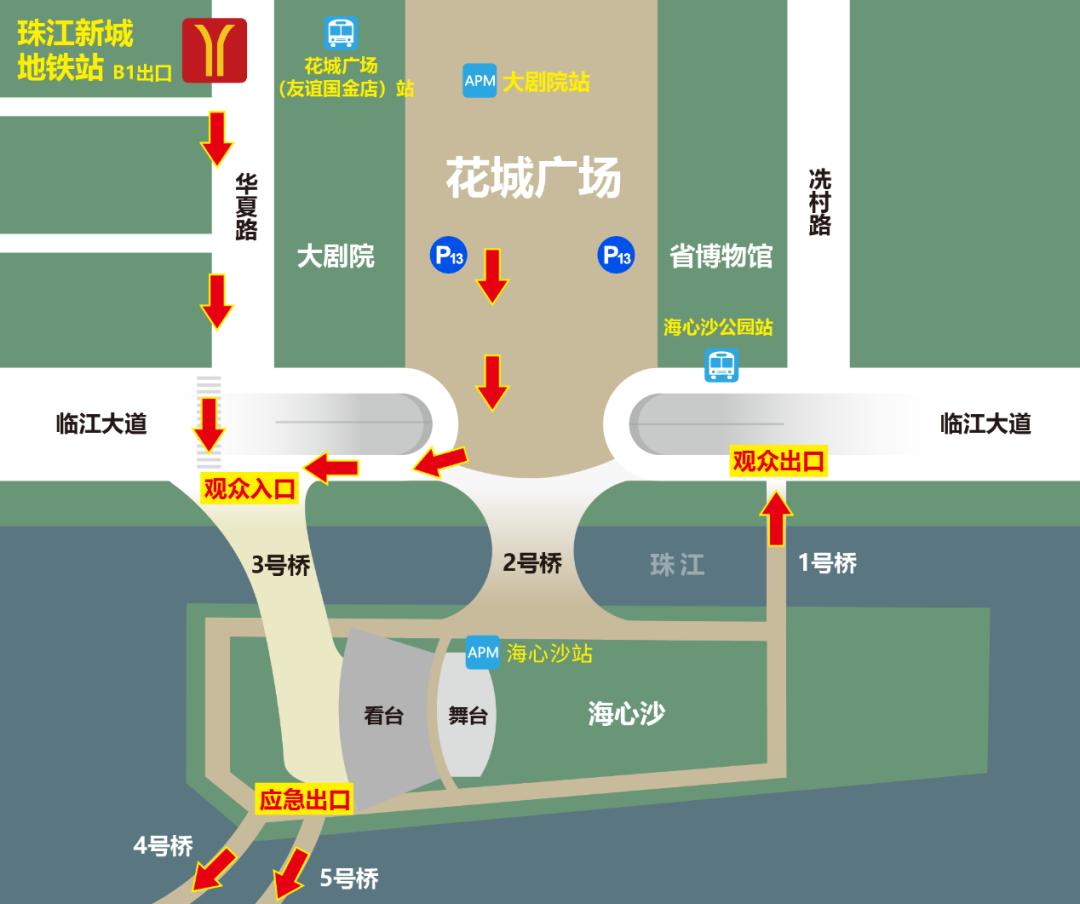 请在预约场次开始前15-30分钟,步行至天河区临江大道海心沙亚运公园3号桥检票口(广州农商银行总行大厦对面)验票进场。