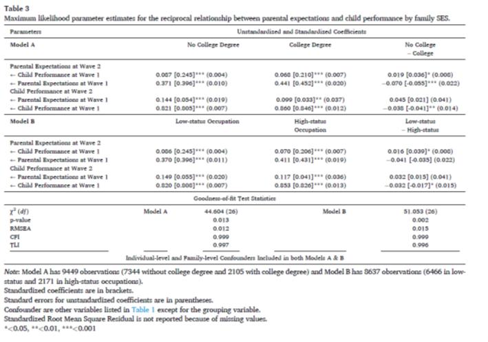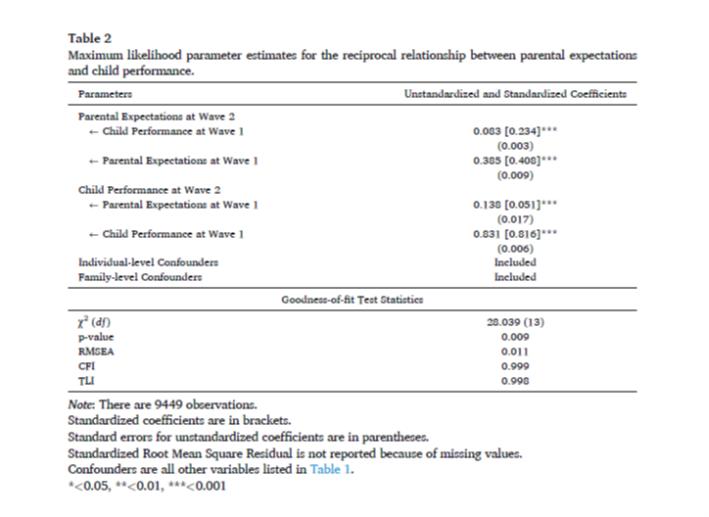 如表2所示,父母教育期望与子女学业成绩之间存在互惠关系。特别是,在控制了初始父母期望和初始子女成绩之后,每增加一个单位的先前子女成绩,父母的教育期望增加0.083年。这一影响在量级上也相对较大,因为在数据集中子女成绩的范围接近17到98。此外,先前子女成绩每增加一个标准差,父母期望增加0.234个标准差,超过先前父母期望对后续期望影响量的半数(即0.408标准差)。换句话说,父母的教育期望会根据子女的表现进行调整,这种适应性在量级上也相当显著。