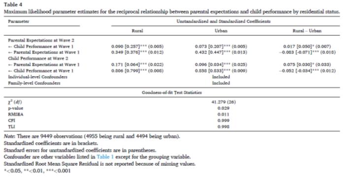 表3和表4显示了父母教育期望适应性在家庭SES和居住地状态下的差异。在这些多组分析中,父母教育期望的适应性和相对响应性特征在所有组中均得到验证。此外,父母教育期望对子女成绩的适应性反应在没有大学学位的父母中显著大于有大学学位的父母,在低社会地位职业家庭中大于高社会地位职业家庭,在农村地区也大于非农村地区。总体而言,在经济和社会不利的家庭中,父母的教育期望对子女的学业表现更具有适应性。此外,不同维度或标准下的适应性差异相当一致,不论是通过父母教育、职业还是居住地状态来衡量不利或有利条件。