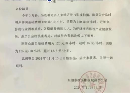 近日网传图片称横店影视城群演降薪,图片显示:“原群众演员基础费用为120元/8小时,超时 15元/小时,调整为135元/10小时,超时13.5元/小时。此调整自2024年11月15日开始实施。”