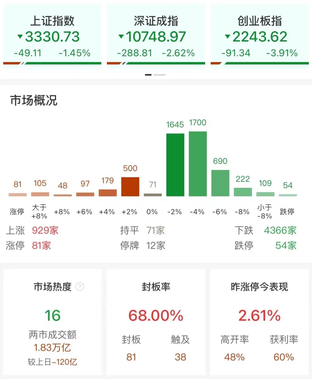 市场午后单边下行,创业板指连续两日跌超3%,多只权重股大跌,同花顺跌近15%,东方财富跌超6%,全市场超4300只个股下跌。沪深两市全天成交额1.83万亿,较上个交易日缩量120亿。