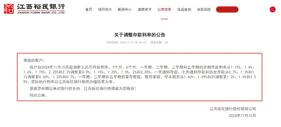 从上述各家银行网站公开信息来看,江西裕民银行年内调整存款利率最为频繁。据财联社记者从江西裕民银行网站了解到,本次已是该行年内第五次公告下调存款利率。此前在今年2月、7月、8月和10月,江西裕民银行也均公告下调存款利率。