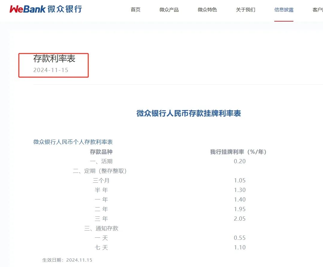 同日,微众银行、新网银行、温州民商银行也在官网公布,从11月15日起执行新的人民币存款利率表。其中,微众银行将活期存款利率调整为0.2%,定期(整存整取)三个月、半年、一年、二年、三年分别调整为1.05%、1.30%、1.40%、1.95%和2.05,通知存款一天、七天分别调整为0.55%和1.10%。